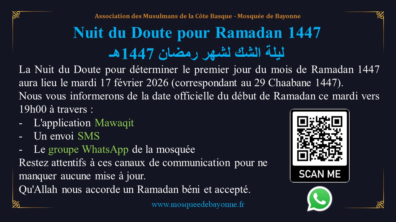 Afin de recevoir toutes les actualités et les informations concernant la mosquée de Bayonne par SMS, il suffit juste d’envoyer un SMS au numéro 06 46 49 96 56 avec seulement votre nom et prénom en contenu.